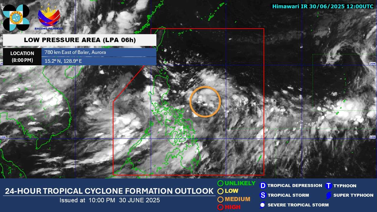 As of 8 p.m. Monday, the weather disturbance was located 720 kilometers east of Baler, Aurora. PAGASA has assessed that the LPA carries a “medium” chance of developing into a tropical cyclone within the next 24 hours.
