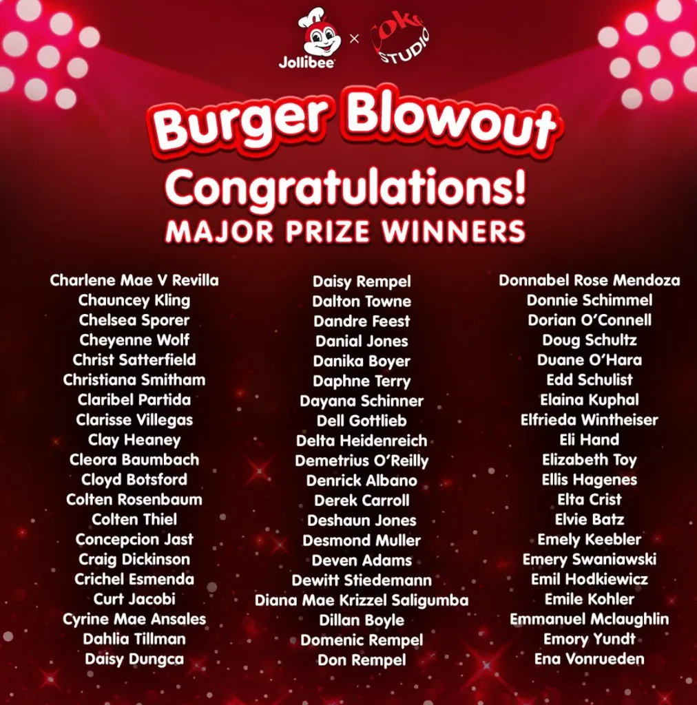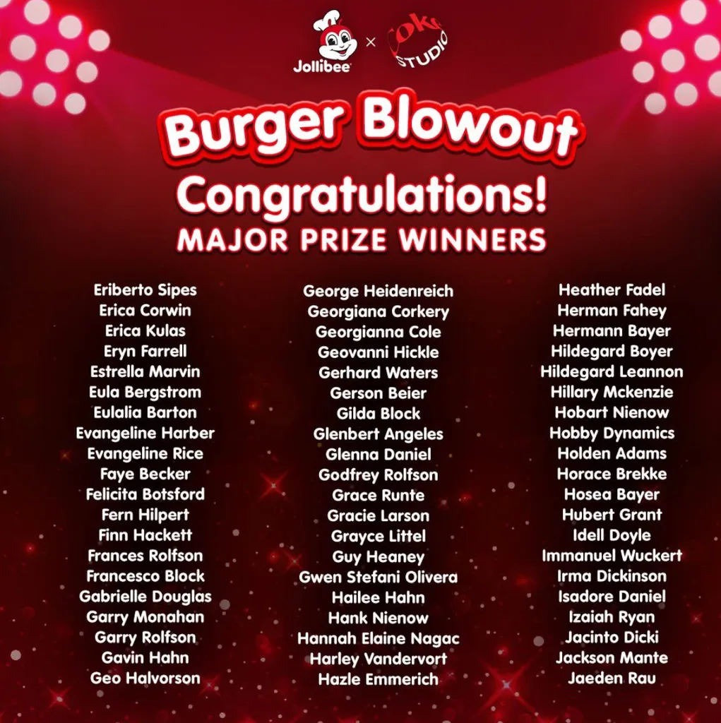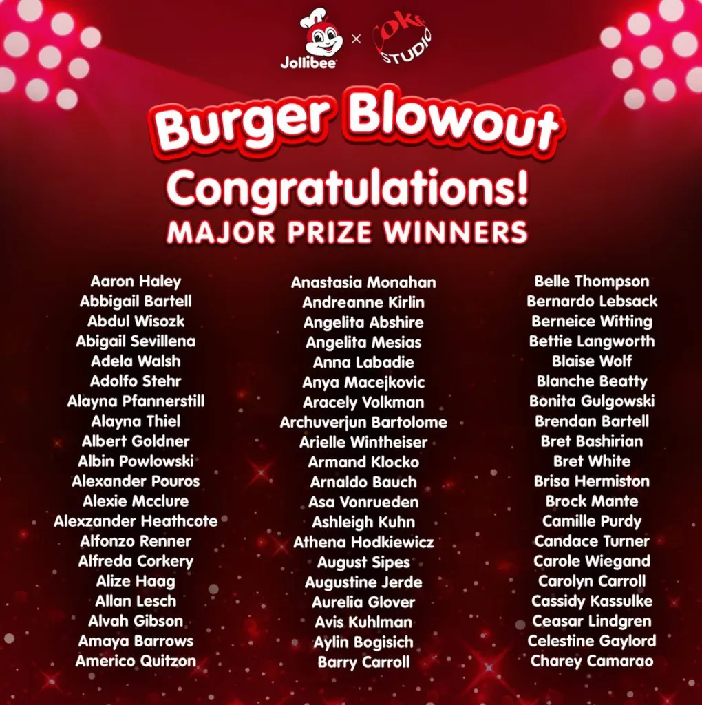 MANILA, Philippines — Fast-food giant Jollibee has come under fire following a raffle draw for its “Burger Blowout” promotion, as netizens accused the company of using fake names for its winners. The controversy erupted after Jollibee’s now-deleted Facebook post announced the Week 3 winners, whose names were deemed suspicious and a source of online ridicule.